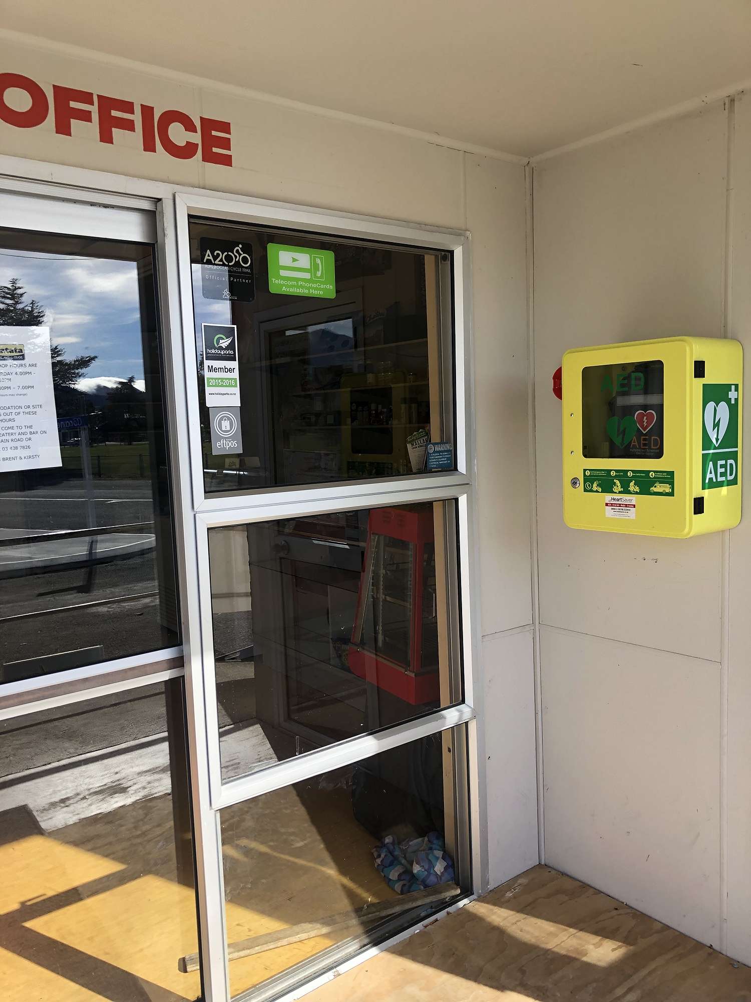 Through our quiz nights at the pub, this AED has been purchased and is publically available outside the holiday park shop door.