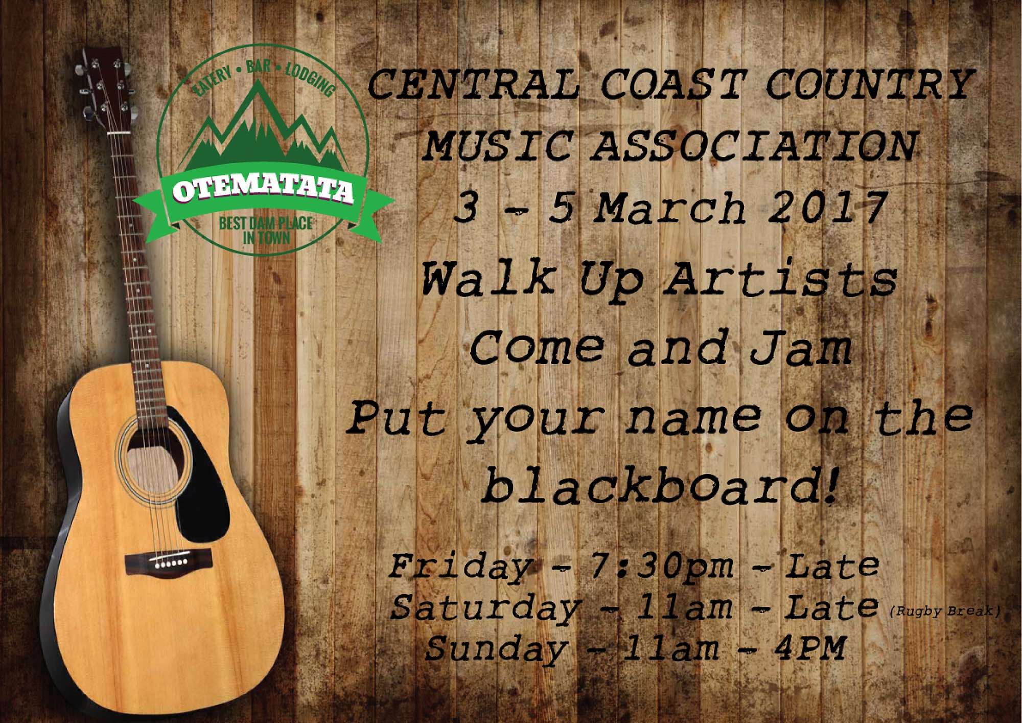 There will be a blackboard to put your name up if you want to participate otherwise just come and listen to our regions top country artists.
