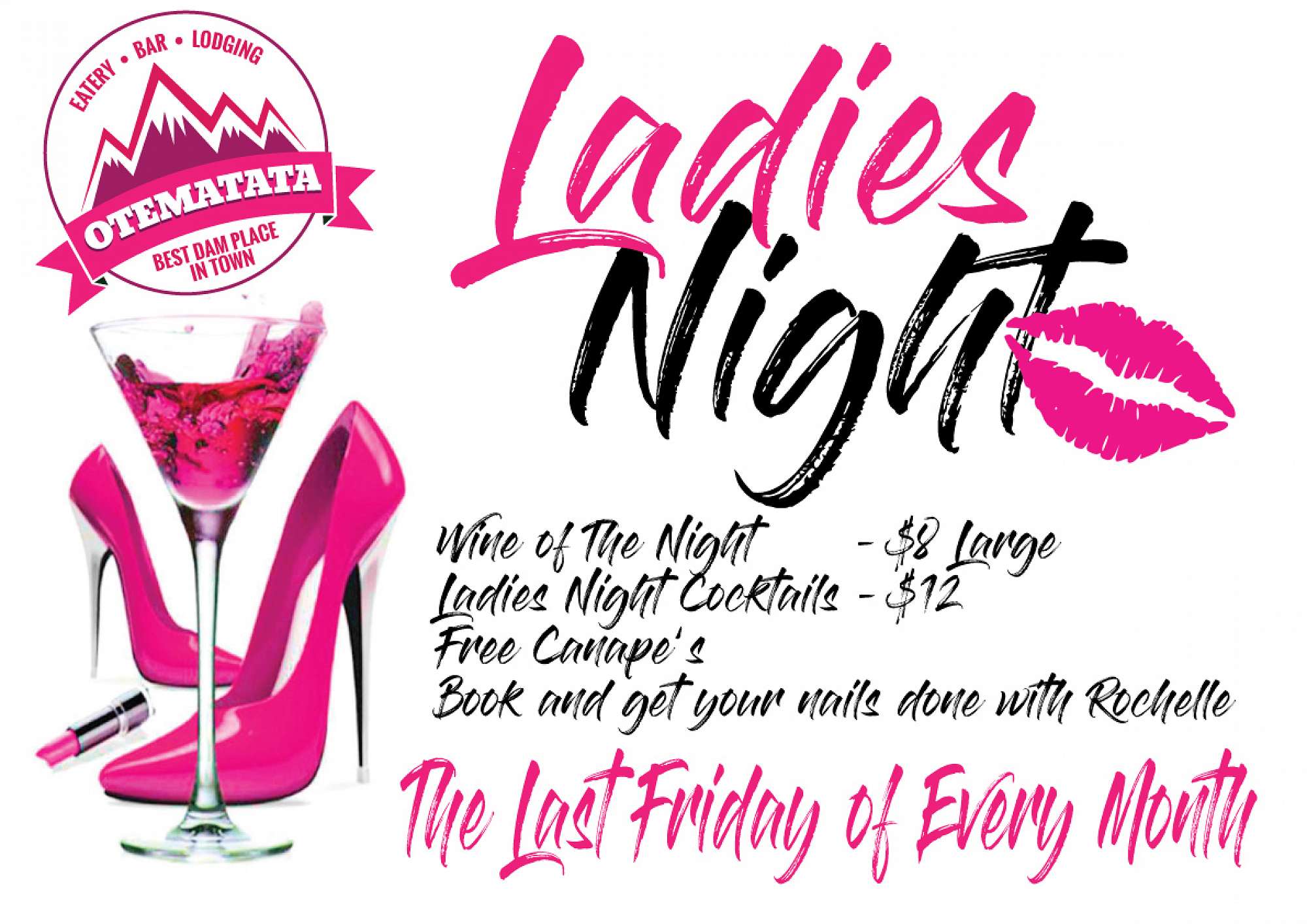 Wine of The Night Deals, Ladies Night Cocktails, Get Your Nails Done by Rochelle, Free Canap's plus your own Ladies Only Area!